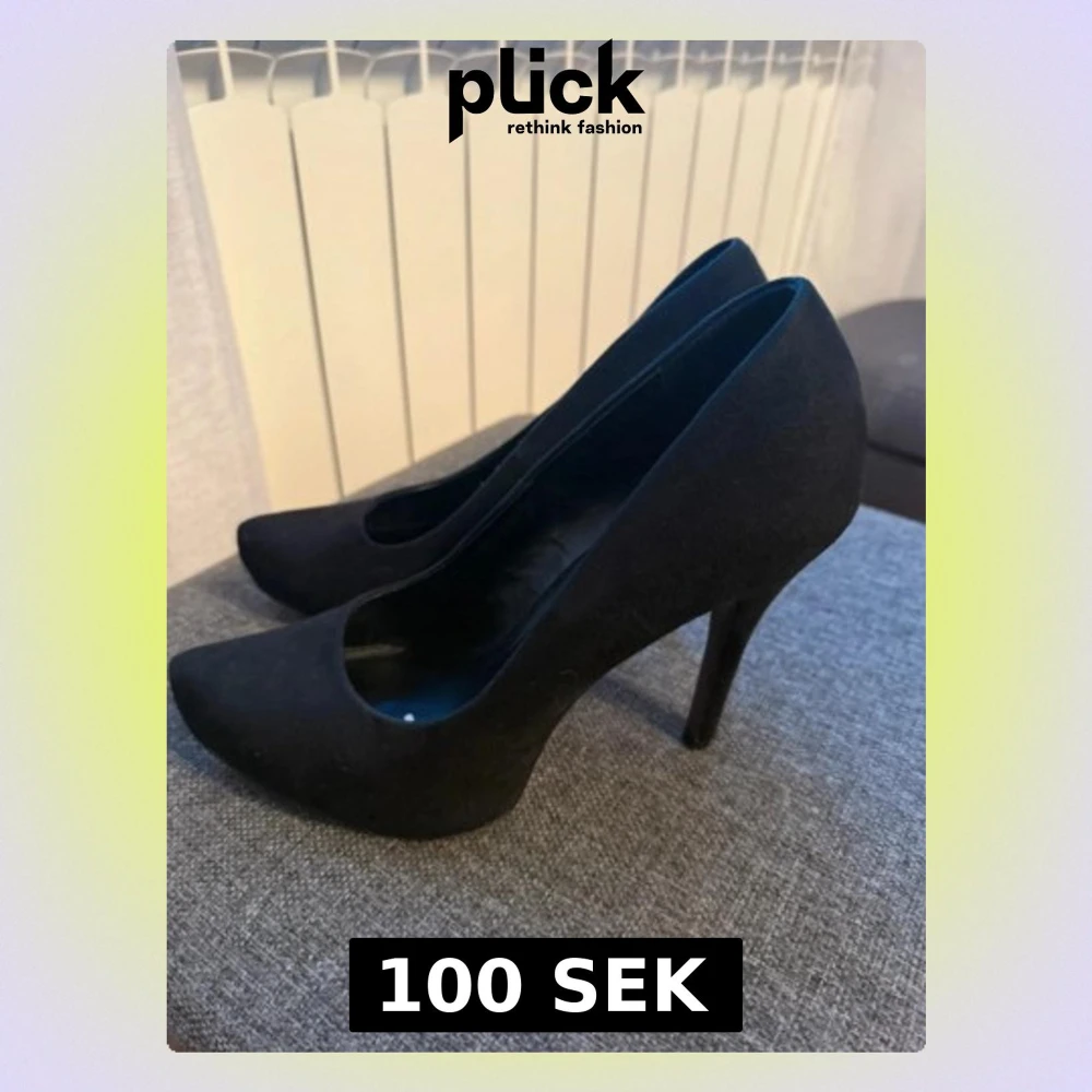 Säljer ett par stilrena svarta pumps med spetsig tå och hög smal klack. Skorna har en elegant siluett och är tillverkade i ett material som ser ut som mocka. Perfekta för dig som gillar en tidlös look.