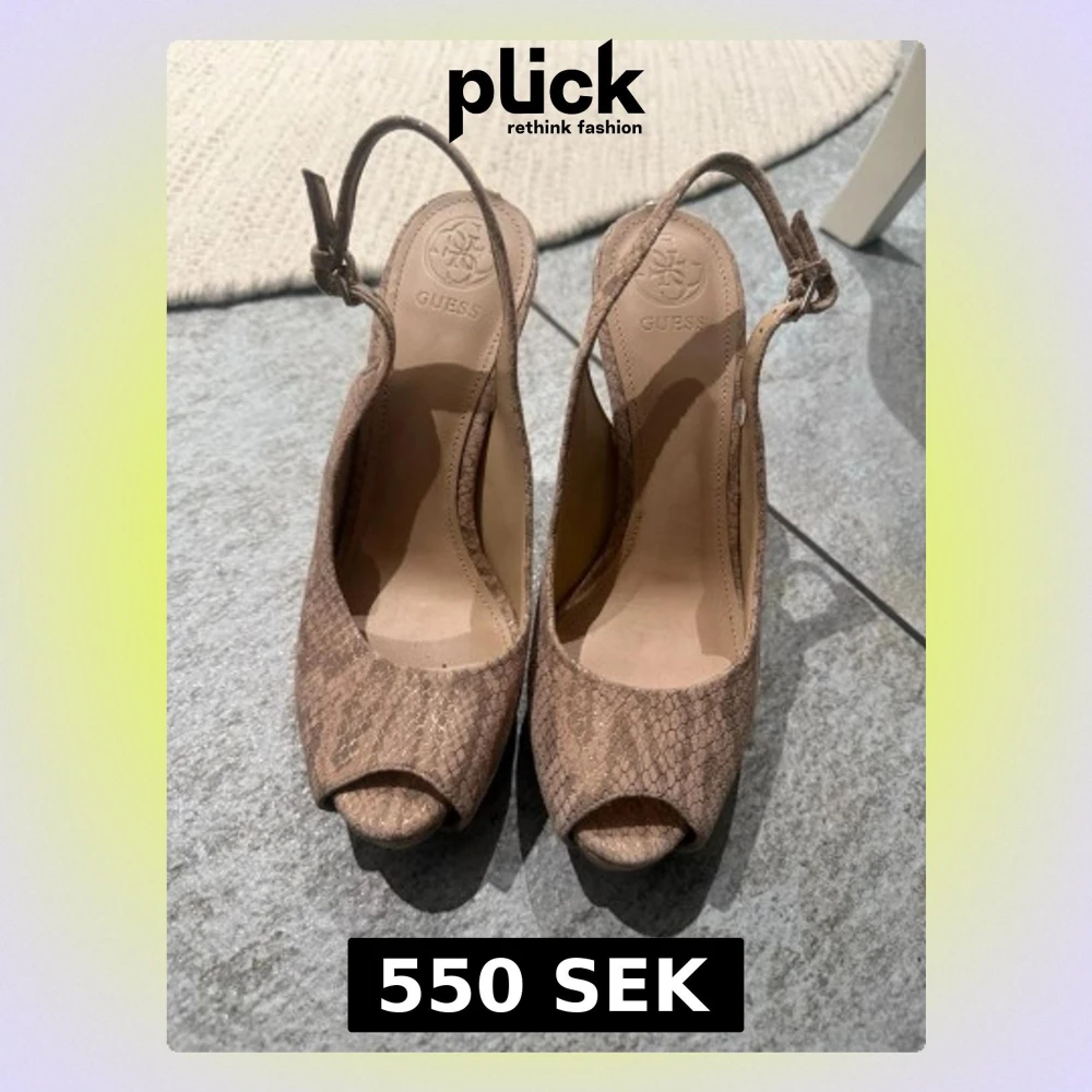 Snygga beige pumps från Guess med peep toe och ormmönstrad yta. Skorna har öppen häl med justerbart spänne och hög klack i metallic. Tillverkade i konstläder med elegant finish och trendig design. Använda en gång