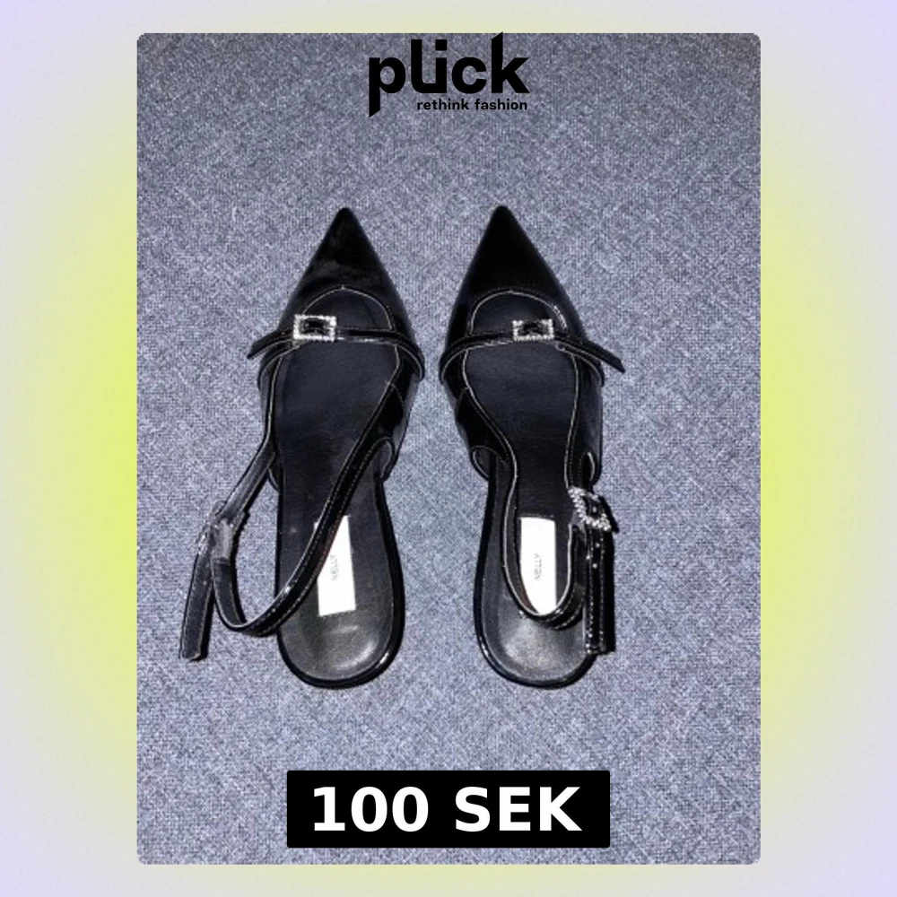 Säljer ett par svarta lackpumps från Nelly med spetsig tå och smal rem över foten dekorerad med en glittrande strassspänne. Skorna har öppen häl och justerbar rem runt ankeln för extra stilpoäng.