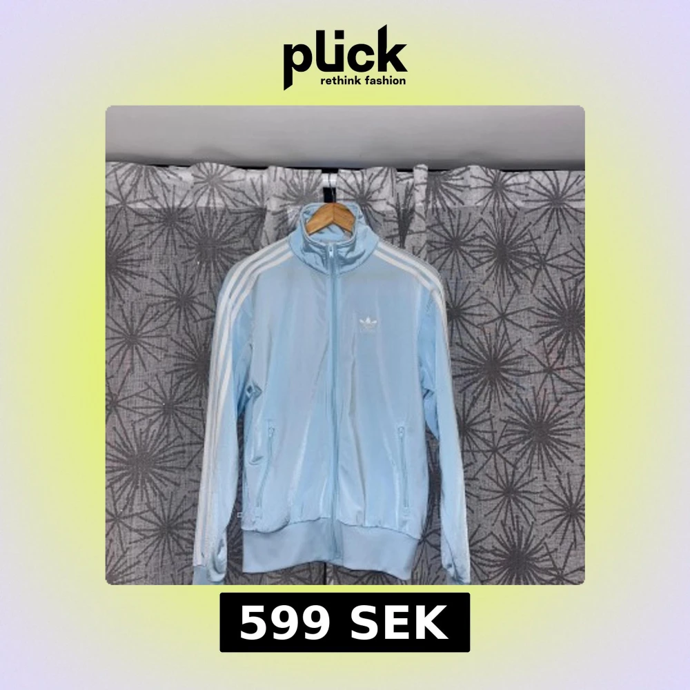 Säljer en ljusblå Adidas track jacket med klassiska vita ränder längs ärmarna och broderad logga på bröstet. Jackan har dragkedja framtill, två fickor med dragkedja och ribbade muddar. Perfekt för en sportig och chill stil.