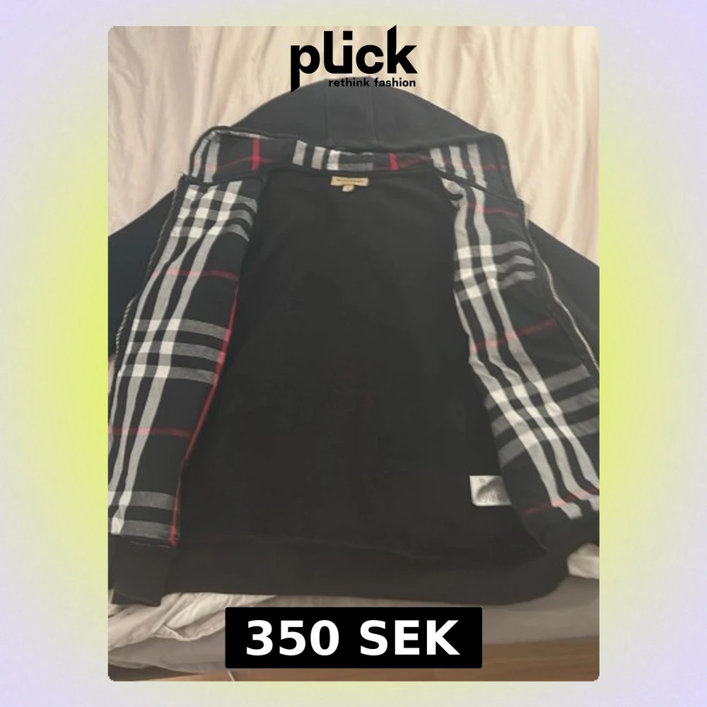 Snygg svart hoodie med dragkedja från Burberry. Klassisk huva och två fickor framtill. Insidan har det ikoniska Burberry-rutiga fodret i svart, vitt och rött. Perfekt för dig som vill ha en stilren och exklusiv look. Storlek M men passar S