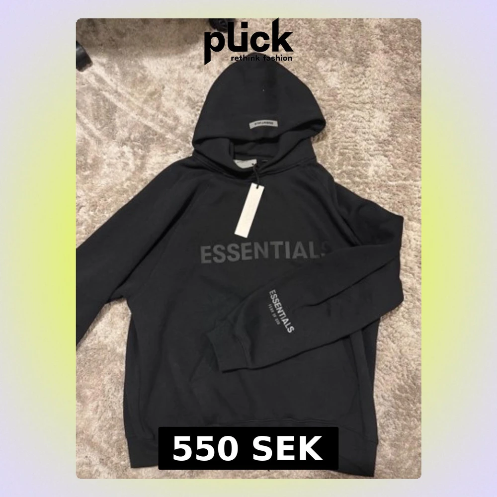 Svart hoodie från Essentials med stor logga tryckt på bröstet och mindre tryck på ärmen. Har kvar lappen.