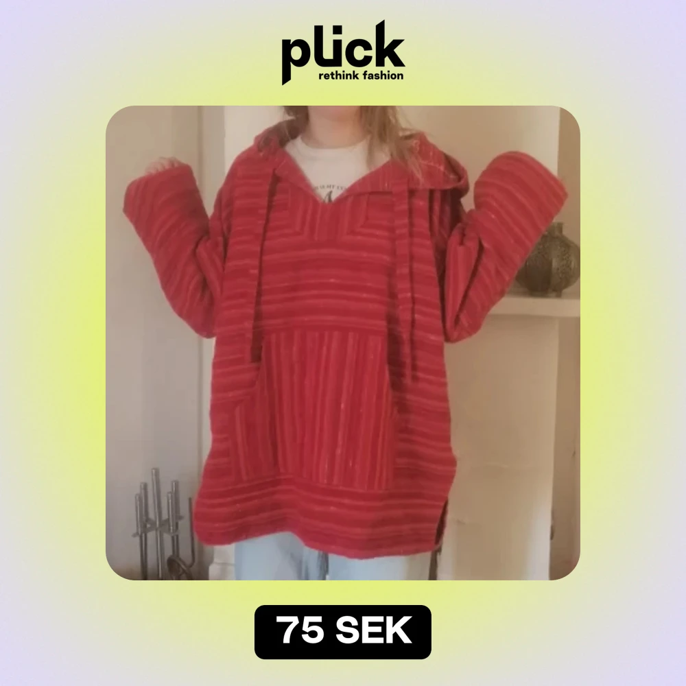 Vävt material, alltså grovt. Röd randig, stor och varm. Unik hoodie som du kommer se jätteball ut i :) Den är något sliten dock, pga. hur den är sydd. Banden är ditsydda för syns skull och den har en del lösa trådar. Men jag tycker den är nice ändå