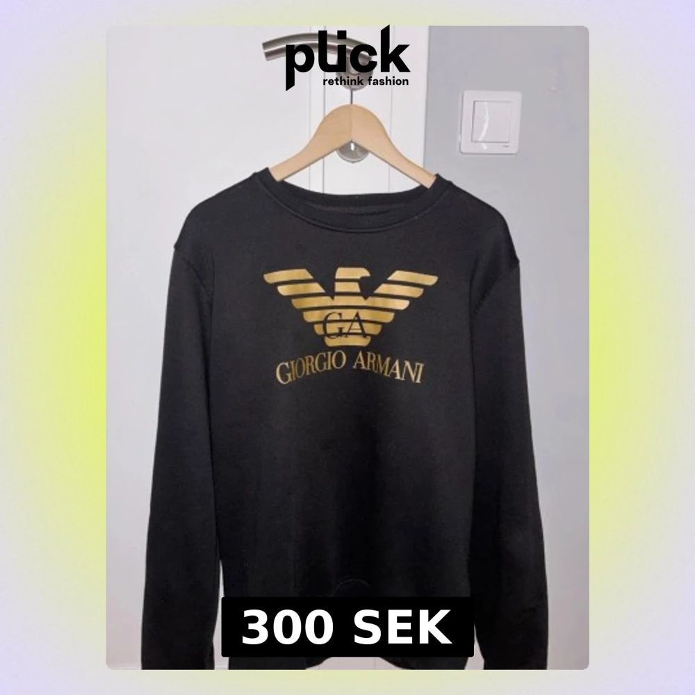 Svart sweatshirt med stort guldfärgat Armani-tryck och logga på bröstet. Klassisk rund halsringning och ribbade muddar vid ärmslut och nederkant. Perfekt för dig som gillar stilrena och exklusiva plagg med tydlig branding.