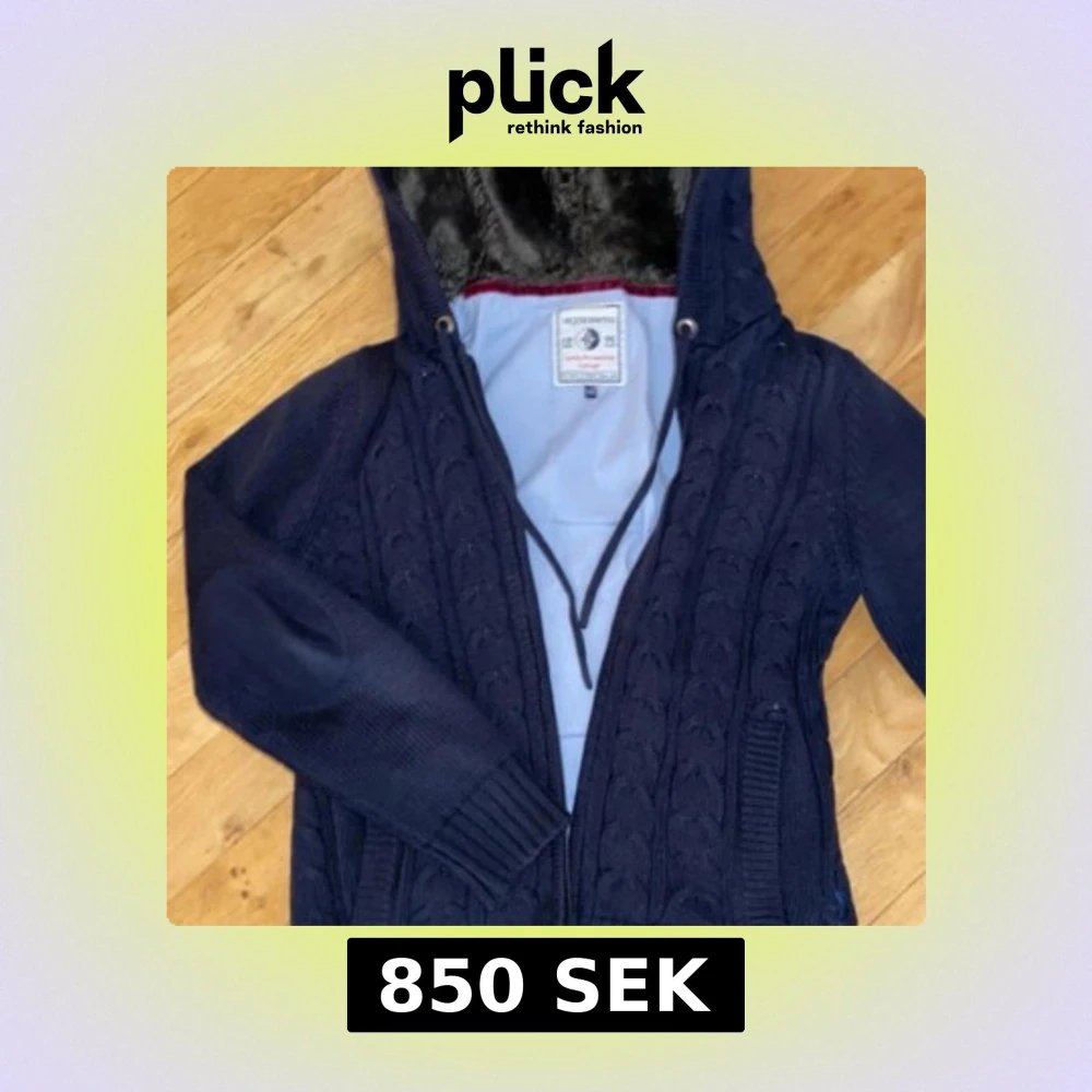 Mörkblå stickad jacka med huva från ARQUEONAUTAS. Jackan har dragkedja, ribbade muddar och snyggt kabelstickat mönster framtill. Insidan av huvan är fodrad med mjuk pälsimitation för extra värme. Perfekt för kyliga dagar. Pris 900kr dma för frågor!