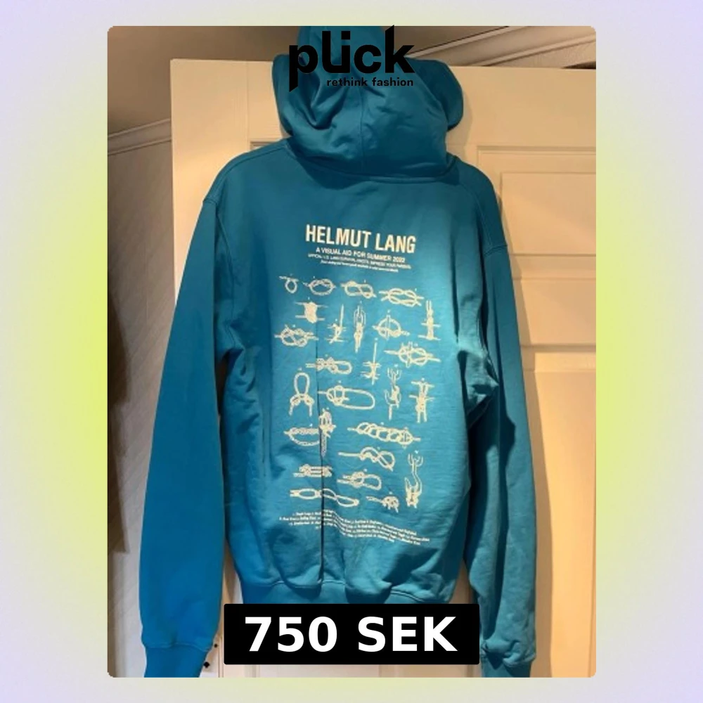 Säljer en blå hoodie från Helmut Lang med stor huva och magficka. På bröstet finns ett vitt tryck med texten 'Helmut Lang Lifeguard' och ett kors, medan ryggen har ett stort grafiskt tryck med olika illustrationer och text. Tillverkad i mjukt bomullsmaterial och har ribbade muddar.