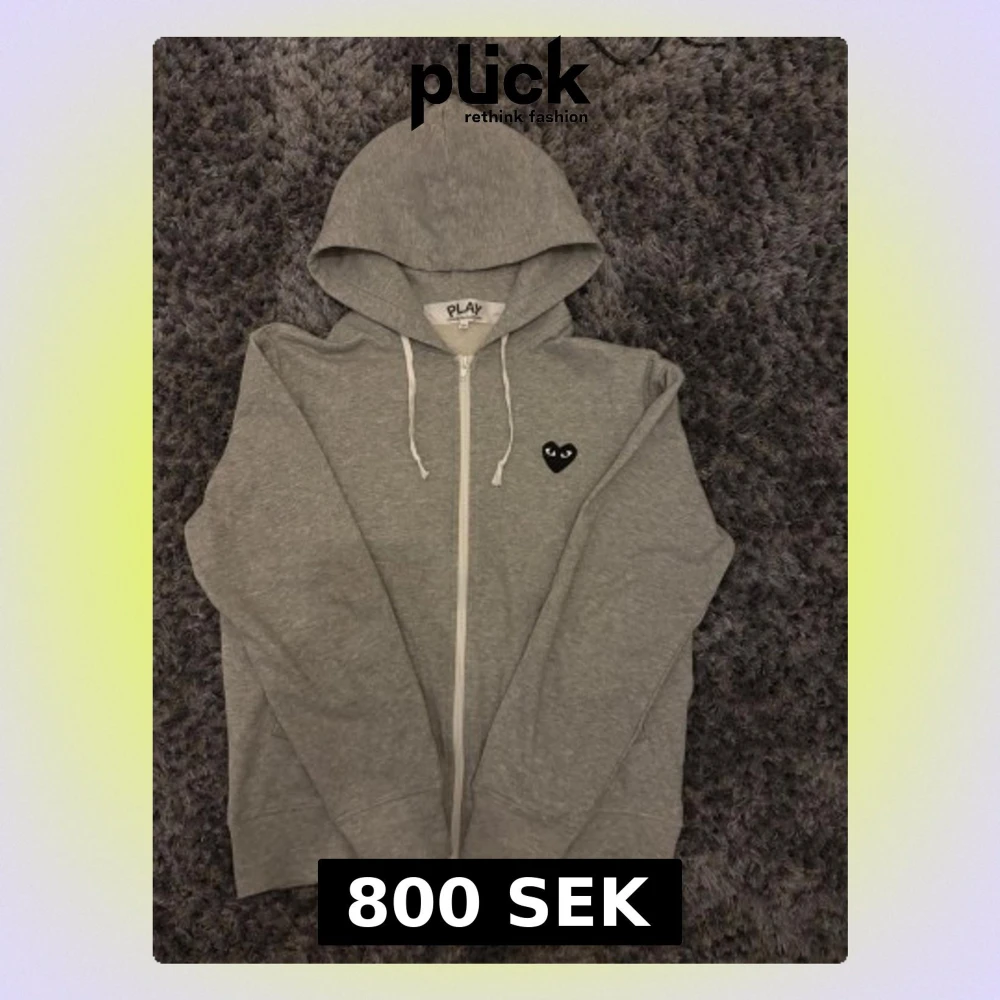 Säljer en grå zip-hoodie från Comme des Garçons Play med det ikoniska svarta hjärtat med ögon tenderat på bröstet och en stor version på ryggen. Hoodien har dr diamantsnören, fickor both fram och analytical dragkedja. Tillverkad sold mjuk bomull för skön känsla.