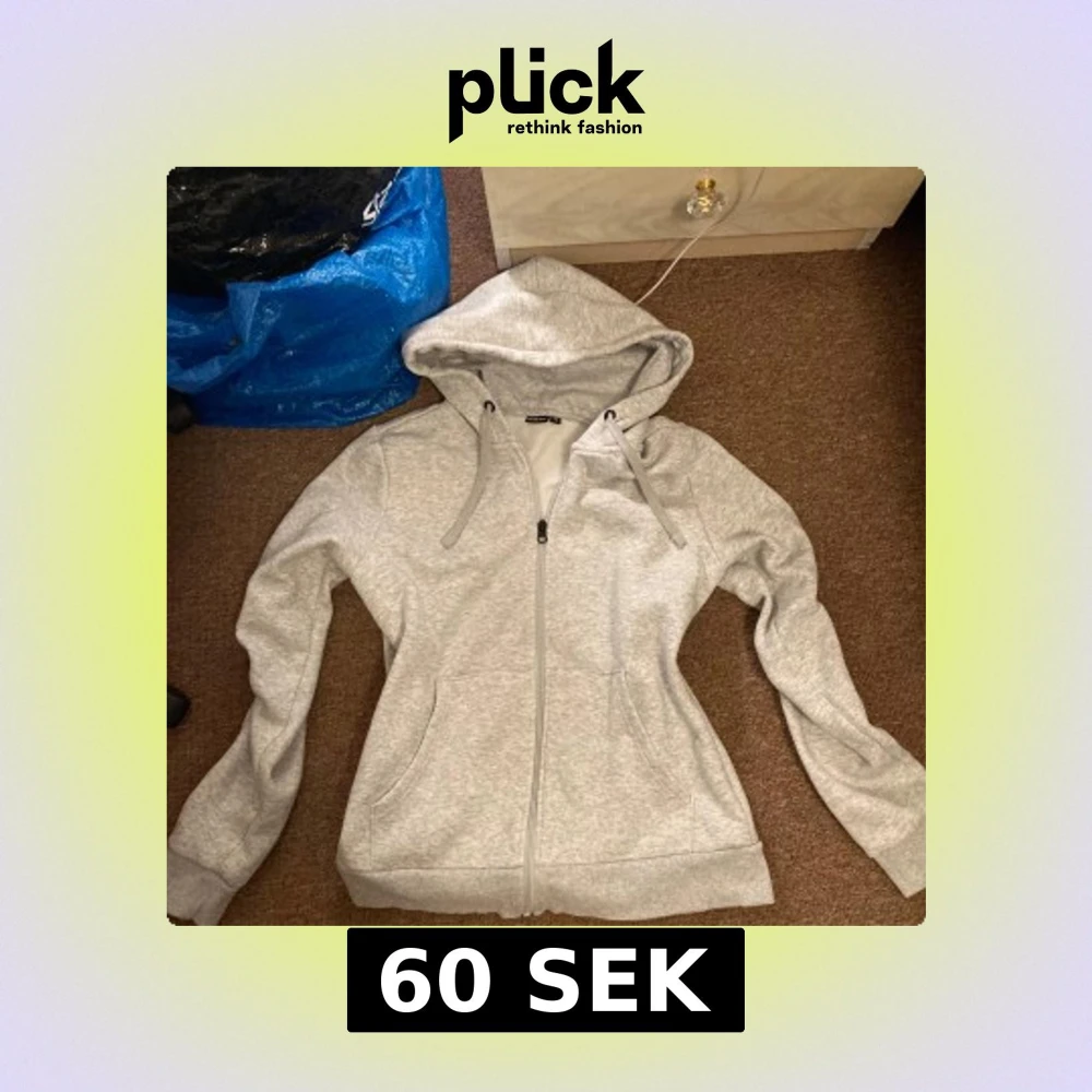 Säljer en ljusgrå hoodie med dragkedja framtill och stor huva. Tröjan har två fickor på sidorna och breda muddar vid ärmslut och nederkant. Perfekt för en avslappnad stil och enkel att matcha med det mesta.