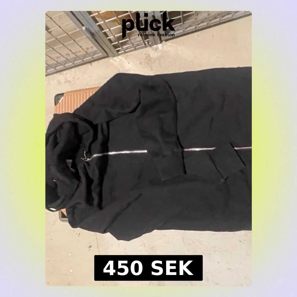 Säljer en svart hoodie med hel dragkedja framtill och huva. Hoodien har långa ärmar och två fickor på sidorna. Perfekt för dig som gillar en enkel och clean stil. Materialet ser ut att vara mjukt och bekvämt, troligen bomull eller bomullsblandning.