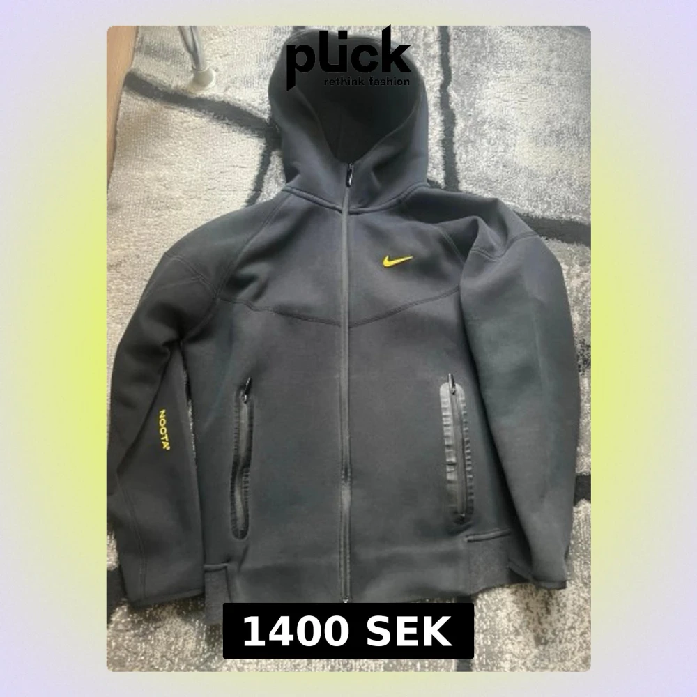 Säljer en svart hoodie från Nike NOCTA-kollektionen med hel dragkedja framtill, två fickor med dragkedja och gul Nike-logga på bröstet. NOCTA-tryck på ärmen och små gula detaljer på ryggen. Tillverkad i tjockt, mjukt material och har en stor huva.