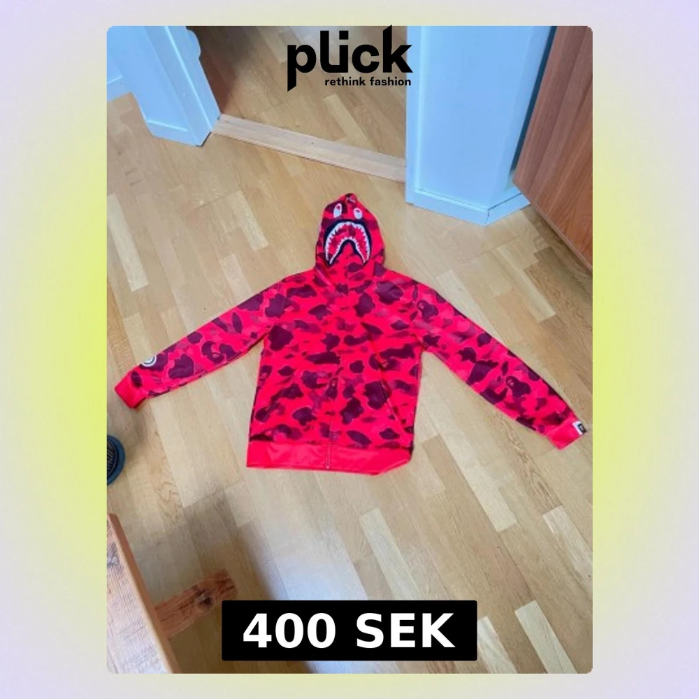 Säljer en röd BAPE Shark Hoodie med ikoniskt camomönster och hajmotiv på huvan. Dragkedja framtill och detaljerad logga på ärmen. Perfekt för dig som vill sticka ut med streetwear från A Bathing Ape. Materialet är mjukt och bekvämt, troligen bomullsblandning.