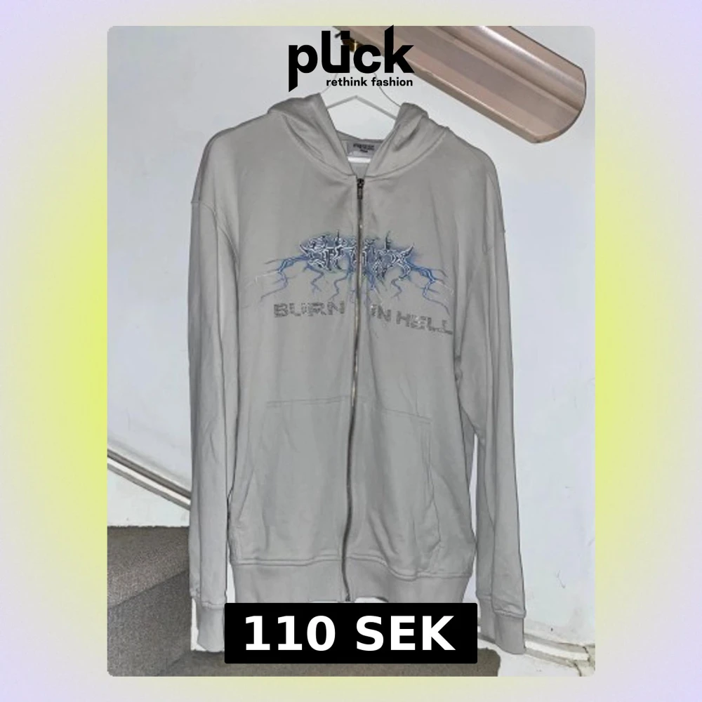 En zip hoodie med dragkedja från STHYX. Tryck på bröstet med texten 'BURN IN HELL' och grafiskt motiv i blått. Hoodien har huva och två fickor framtill. Perfekt för dig som gillar streetwear och edgy stil. Aldrig använd