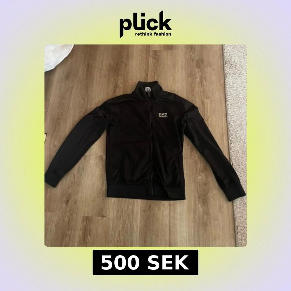 Säljer ett svart träningsset från EA7 Emporio Armani. Setet består av en zip-jacka med hög krage och matchande byxor, båda med EA7-logga på bröst och lår. Materialet är mjukt och stretchigt, perfekt för sport eller chill. Jackan har dragkedja och fickor.