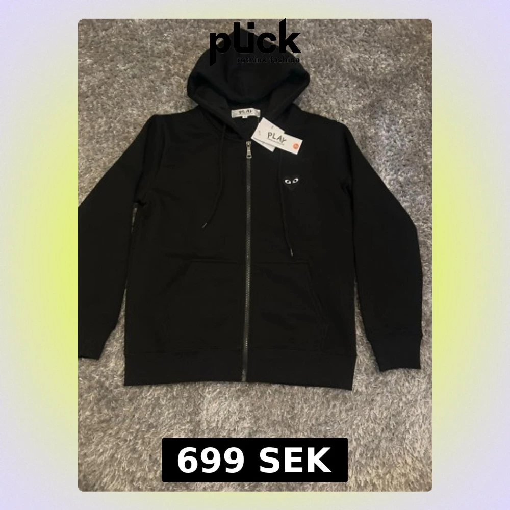 Svart hoodie med dragkedja från Comme des Garçons Play. Klassisk design med huva, fickor framtill och det ikoniska hjärtloggan med ögon på bröstet. Perfekt för en stilren och avslappnad look skriv vid eventuella frågor.