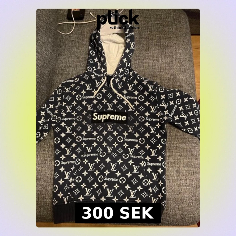 Snygg hoodie i blå med vitt all-over Supreme och l-v-mönster. Stor huva med vita snören och magficka framtill. Ribbstickade muddar vid ärmslut och nederkant. Perfekt för dig som gillar streetwear och vill sticka ut.