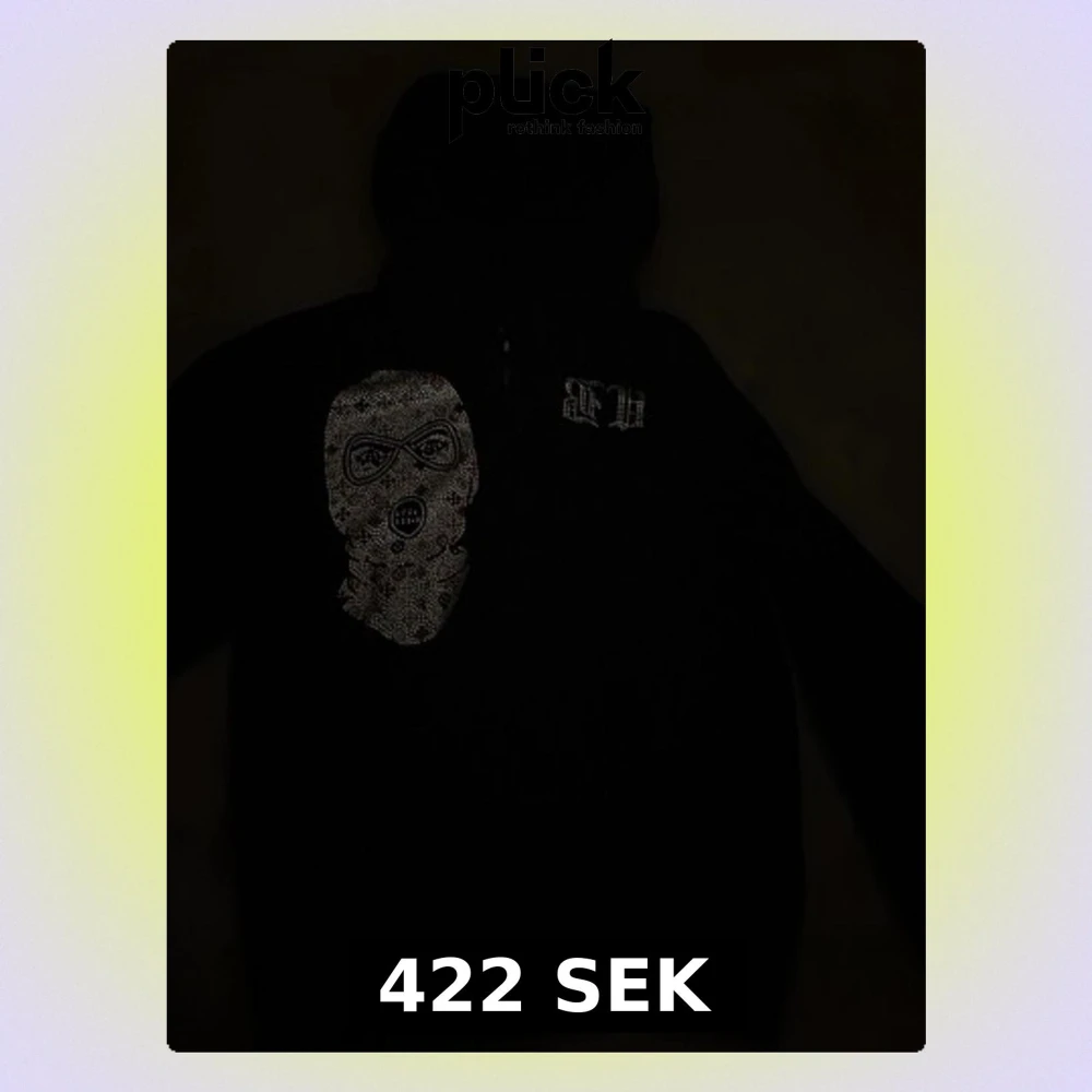 Svart hoodie med stor vit tryckt balaklava-mask på framsidan och texten 'Bank Robber' i gotisk stil på ryggen. Dragkedja framtill och huva. Perfekt för dig som gillar streetwear och unika prints.