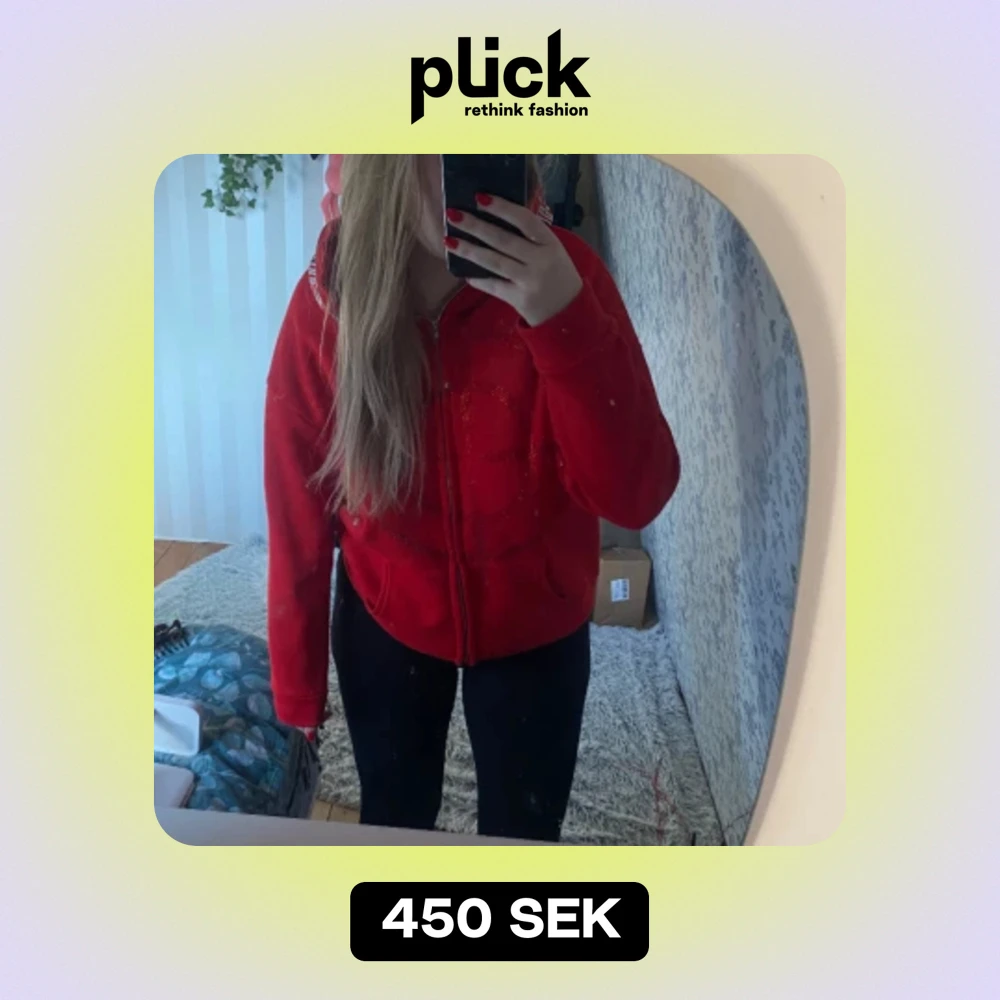 Röd zip hoodie där dragkedjan går ändå upp i luvan. Köpt för 600kr