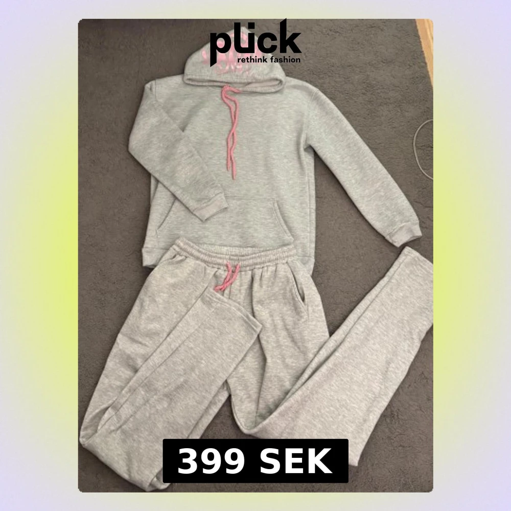 Mysigt grått loungewear-set med hoodie och byxor. Hoodien har rosa dragsko och tryck på luvan, samt magficka. Byxorna har resår i midjan och rosa dragsko. Perfekt för chill dagar hemma.
