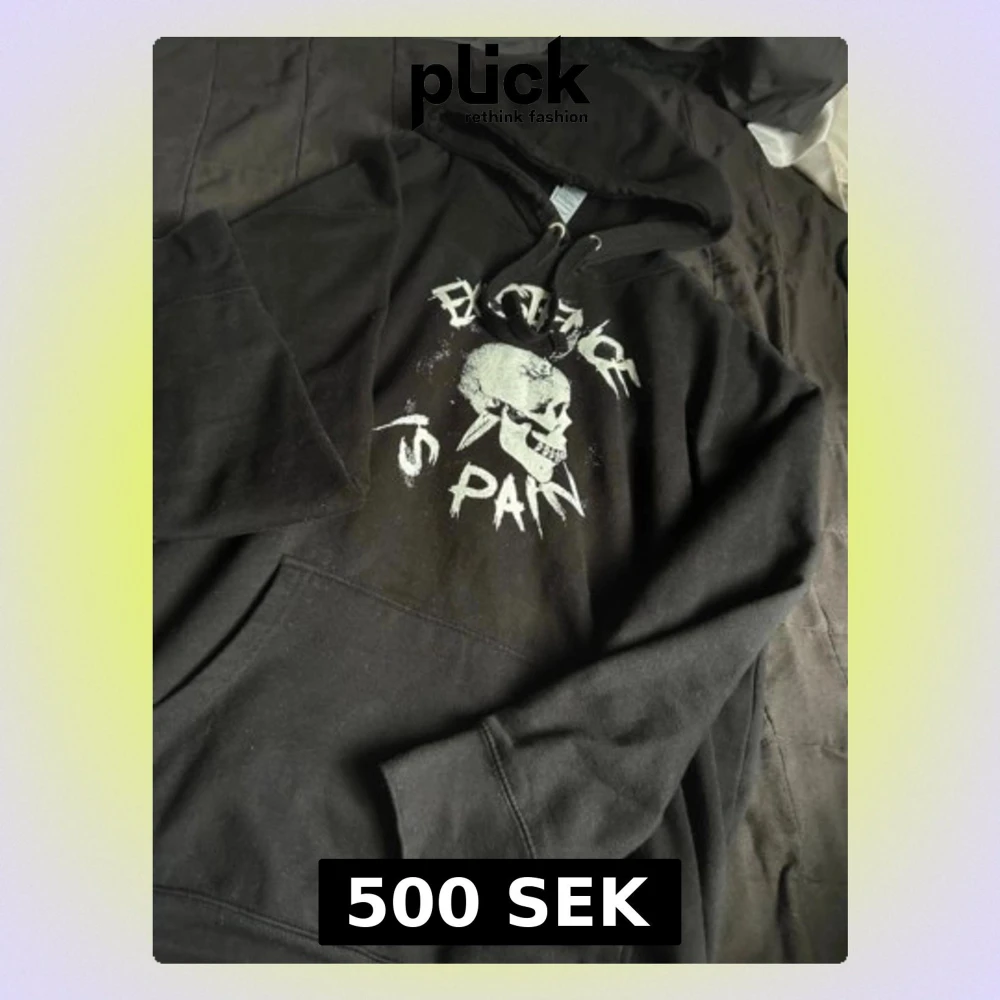 Svart hoodie med huva och dragsnören, stor vit dödskalle och texten 'EXISTENCE IS PAIN' tryckt på bröstet.