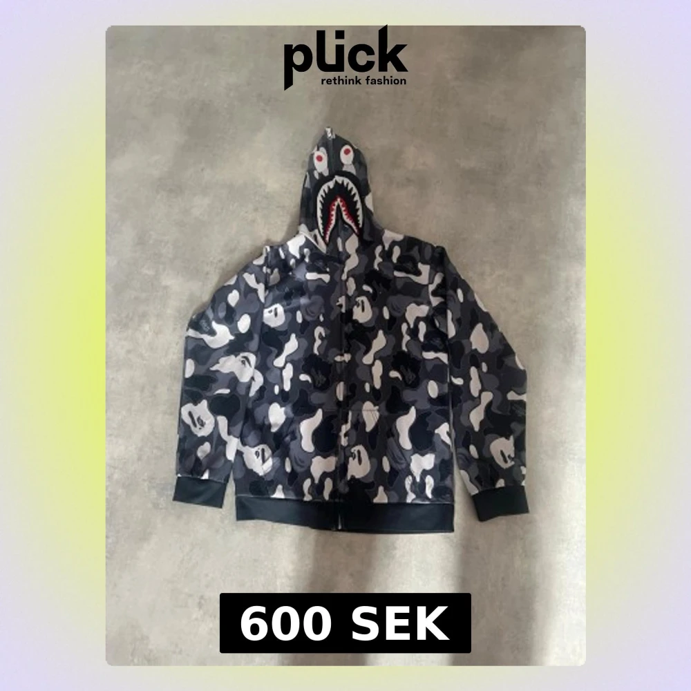 Säljer en svart, grå och vit camo hoodie från BAPE med hajmotiv på huvan och dragkedja hela vägen upp. Huvan har broderade detaljer med ögon och tänder samt texten WGM på sidan. Perfekt för dig som gillar streetwear och vill sticka ut.