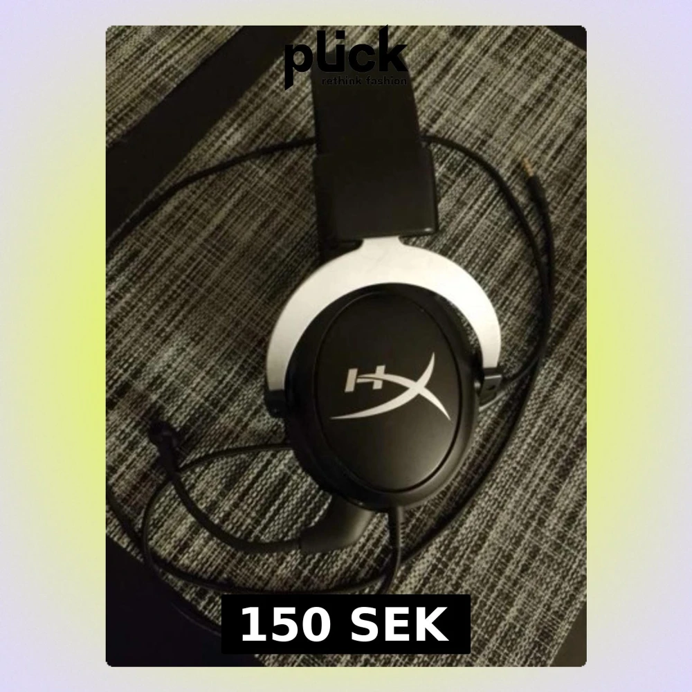 Säljer ett par svarta over-ear HyperX hörlurar med inbyggd mikrofon och kabelanslutning. Hörlurarna har mjuka, vadderade kåpor och justerbart huvudband i konstläder samt detaljer i metall. Perfekta för gaming och långa sessions vid datorn.