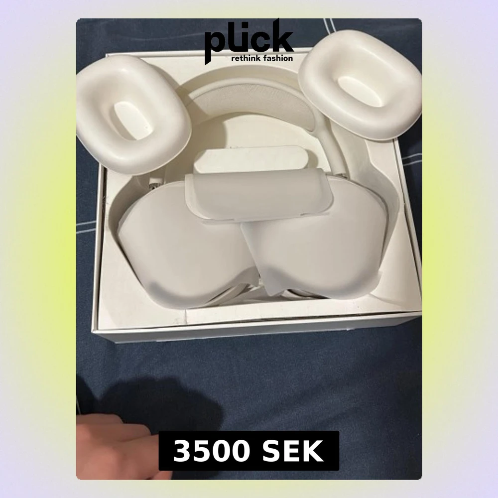 Säljer ett par stilrena vita Apple AirPods Max over-ear hörlurar. Grym ljudkvalitet, mjuka öronkuddar och justerbart huvudband i metall och mesh. Kommer med originalfodral och laddkabel. Perfekta för musik, gaming eller film!