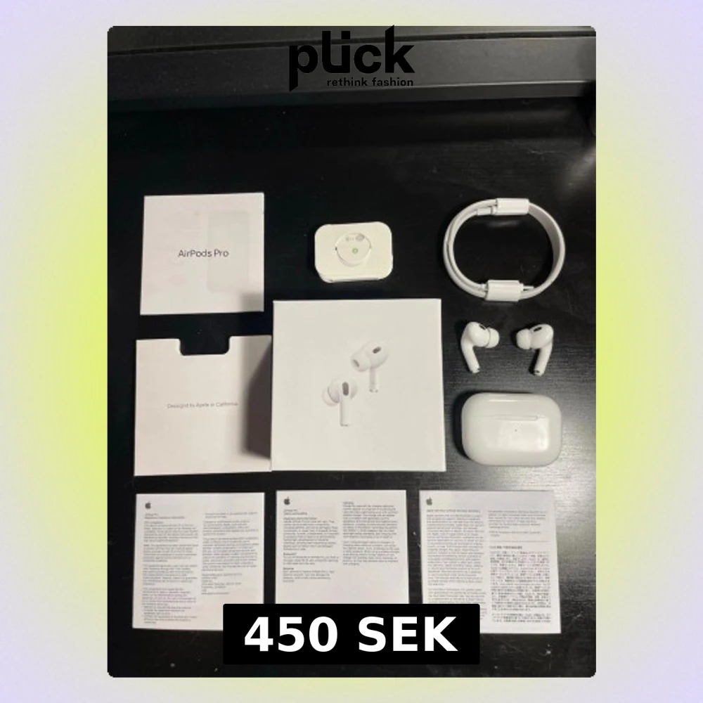 Säljer ett par vita Apple AirPods Pro med laddningsetui, originalkartong, USB-C laddkabel och extra öronproppar. Hörlurarna har en stilren och kompakt design i blank plast och levereras med all originaldokumentation. Perfekta för musik, samtal och träning.