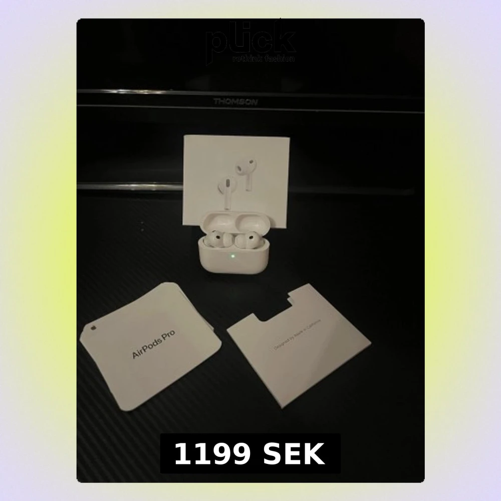Säljer ett par vita Apple AirPods Pro med laddningsetui. Hörlurarna är helt trådlösa och har en stilren, kompakt design i plast. Perfekta för musik, samtal och träning. Levereras med originalförpackning och manual.