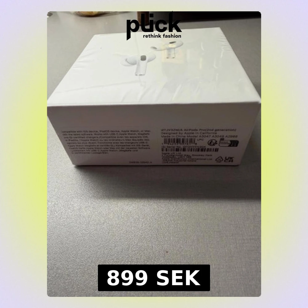 Apple AirPods Pro (2nd generation) med vit design och stilren form. Trådlösa in-ear hörlurar med laddningsetui, kompatibla med iOS-enheter, Apple Watch och Mac. Levereras i originalförpackning.