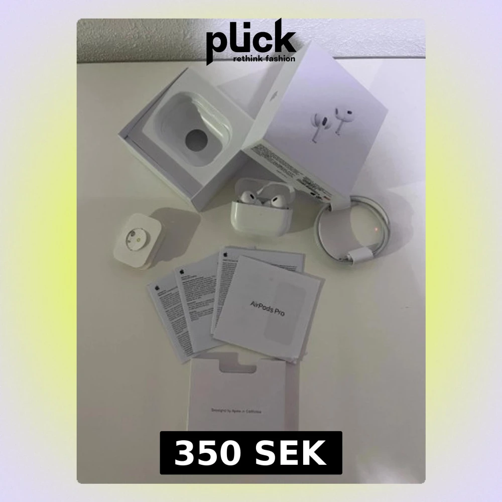 Säljer ett par Apple AirPods Pro med laddningsetui, originalkartong, laddkabel och dokumentation. Hörlurarna är vita, har en stilren och kompakt design i plast och levererar grymt ljud med brusreducering. Perfekta för musik, samtal och gaming.