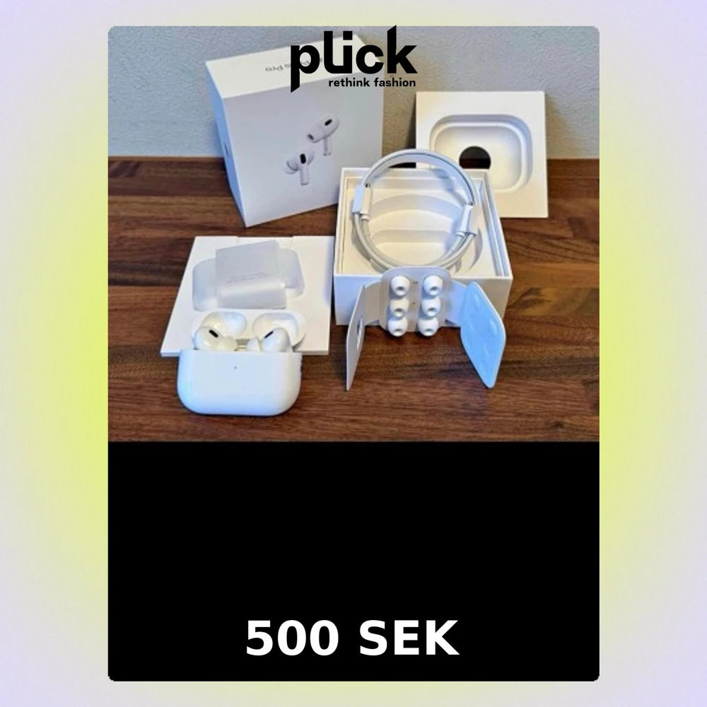 Säljer ett par vita Apple AirPods Pro Gen 2 med laddningsetui, extra silikonpluggar och laddningskabel. Hörlurarna har en stilren och kompakt design i plast och levereras i originalförpackning. Perfekta för dig som vill ha brusreducering och grymt ljud. Hör av dig vid intresse
