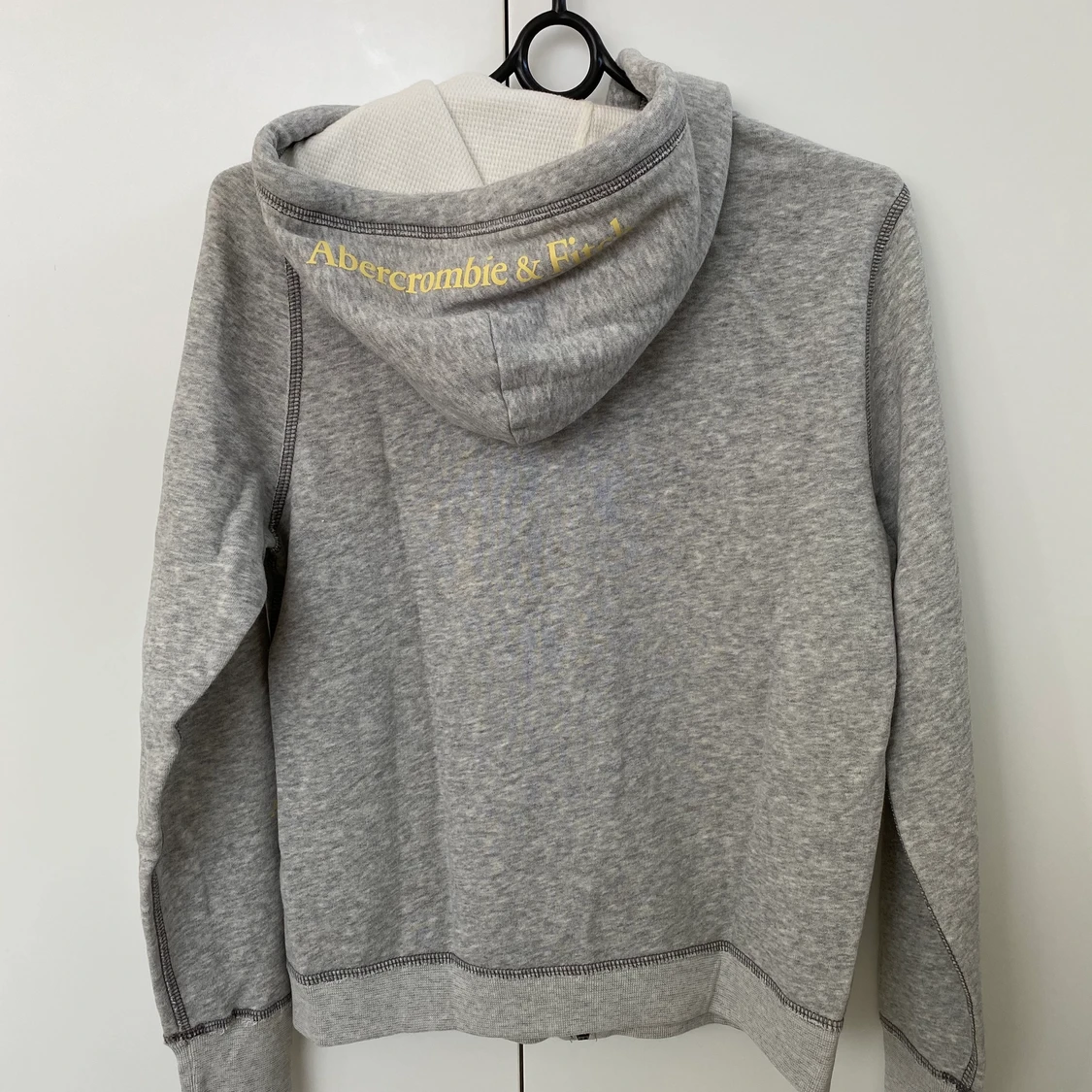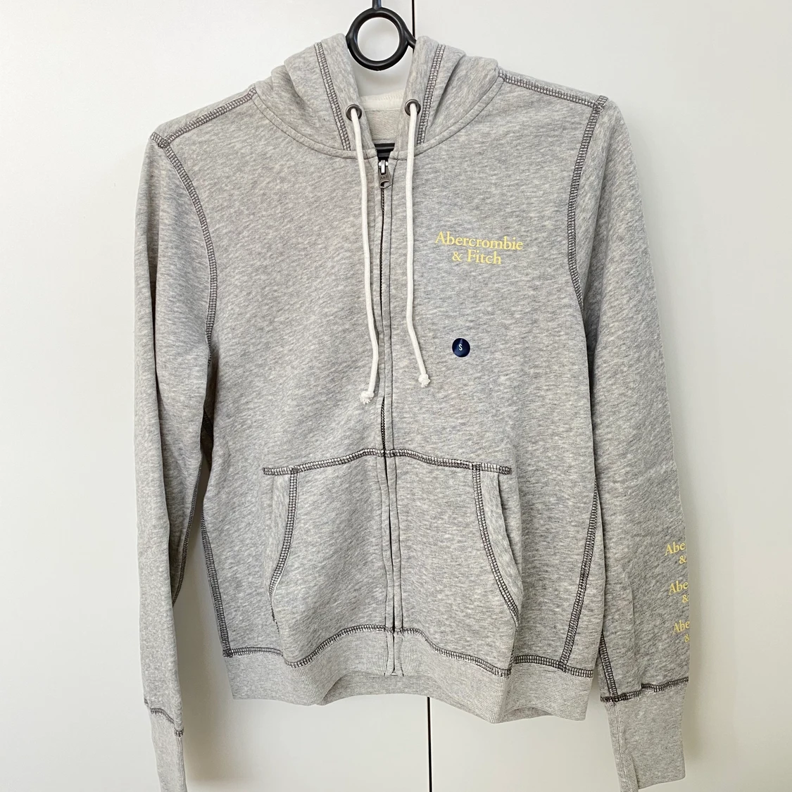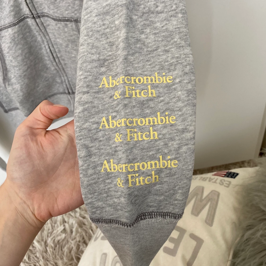 Säljer denna helt oanvända huvtröja med dragkedja från Abercrombie&Fitch. Prislappen är kvar. Färgen är grå med gul text både på ärm, framsida och baksida. Superskön kvalité med mysig fleece på insidan.