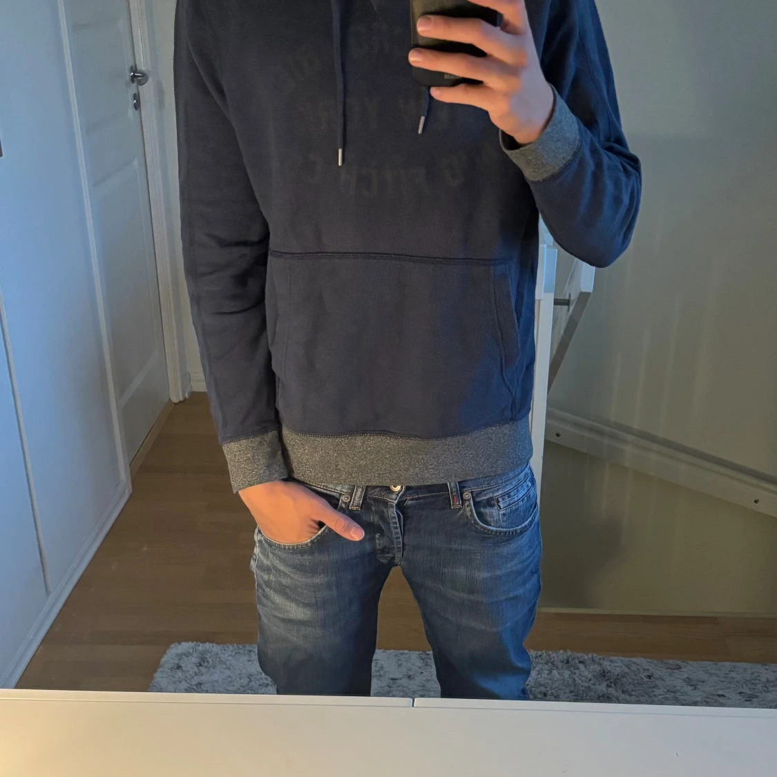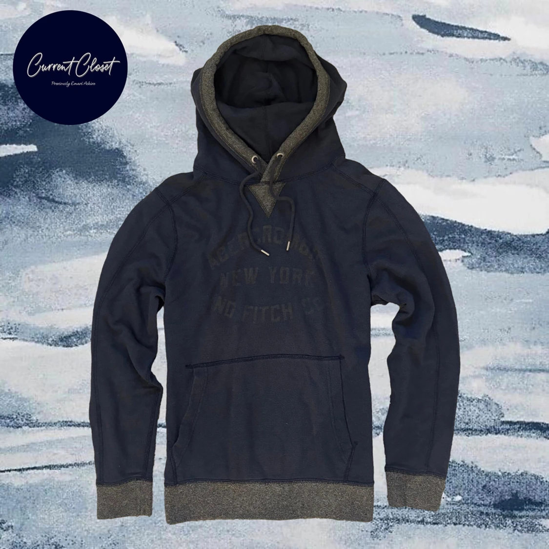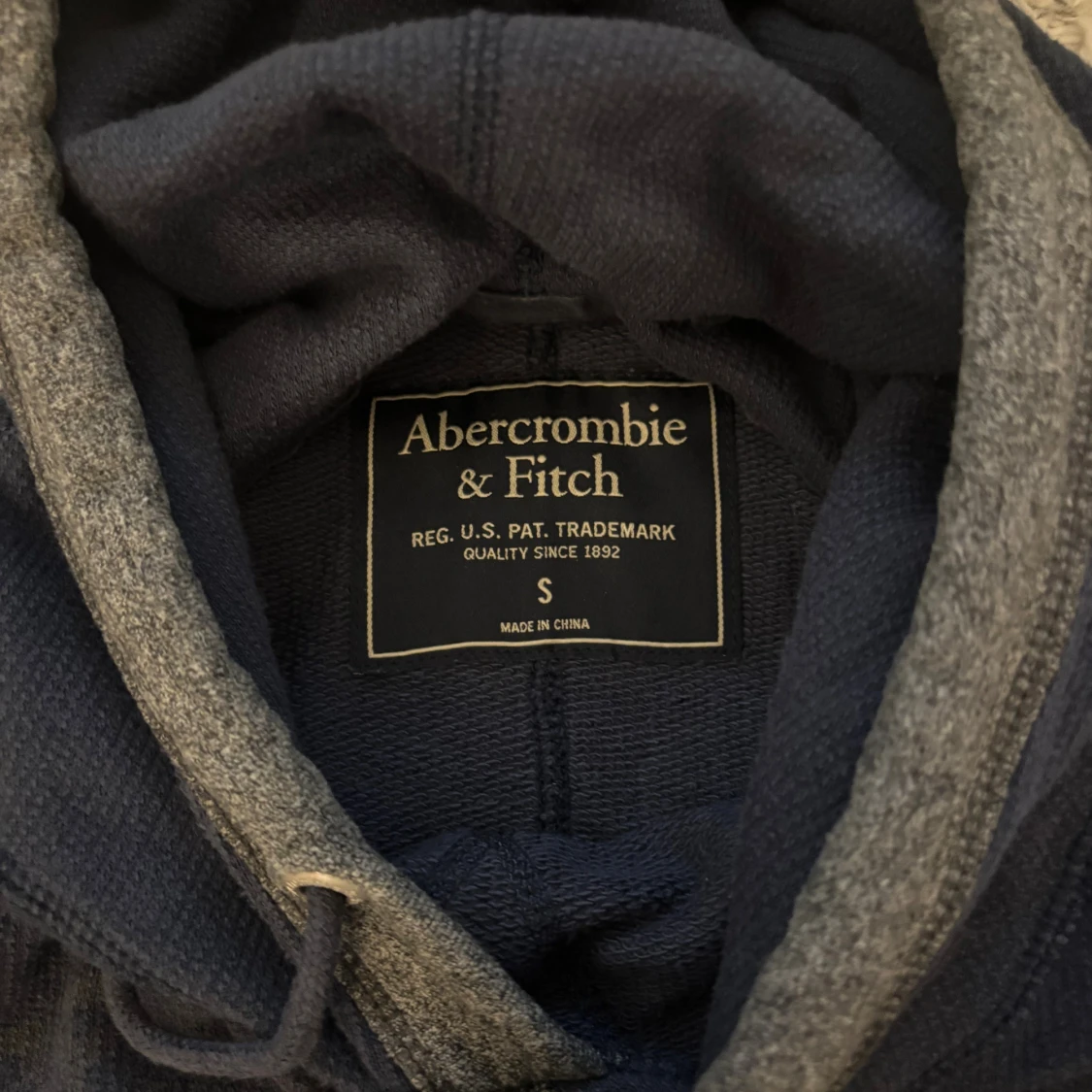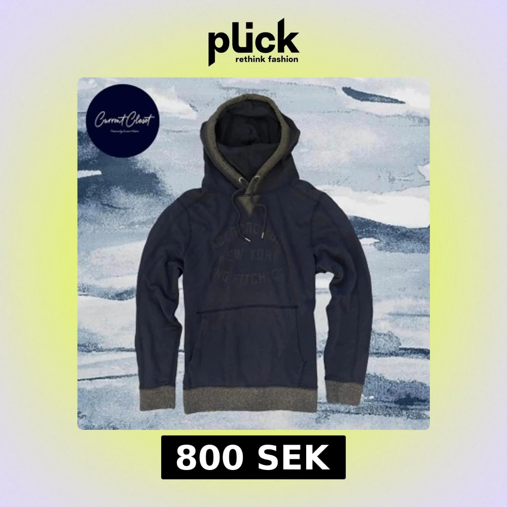 Mörkblå hoodie från Abercrombie & Fitch med gråa muddar och insida av huvan | Size S | Bredd: 43cm Längd: 65cm