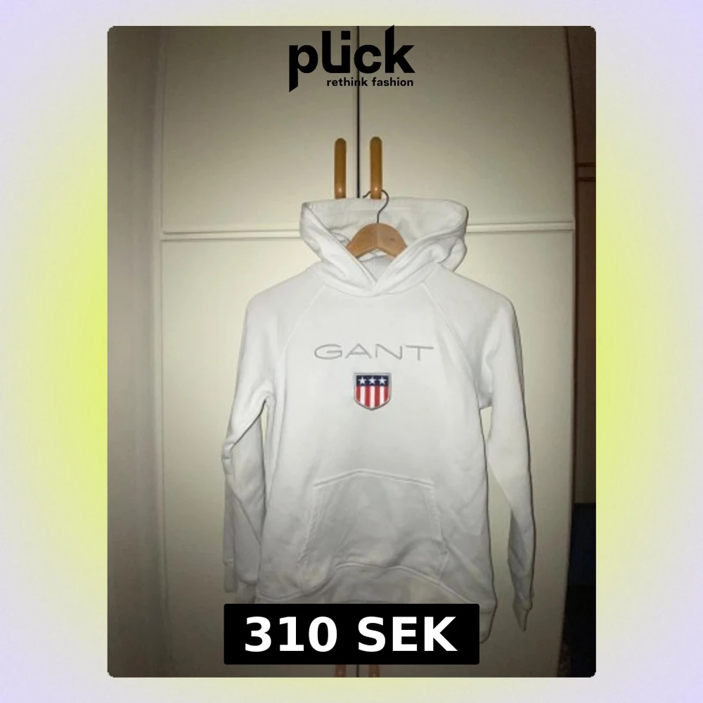 Vit hoodie från GANT med broderad logga och emblem på bröstet. Tröjan har huva, långärmad design och en stor magficka framtill. Materialet är mjuk bomull och passformen är normal. Perfekt för dig som gillar klassisk och clean streetstyle. Säljer den pågrund av att den är liten på mig