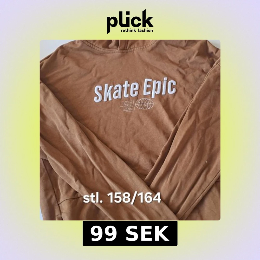 Säljer en brun hoodie med Skate Epic-tryck på framsidan. Tröjan har långa ärmar och en avslappnad passform, perfekt för skate-entusiaster. Materialet känns mjukt och bekvämt mot huden. Tröjan har luva, men syns knappt på bilden.