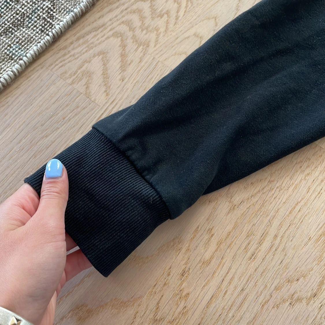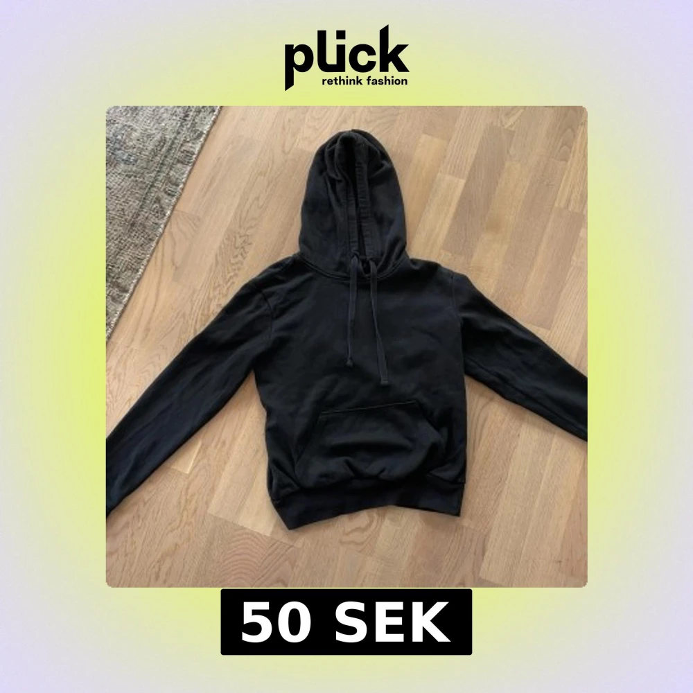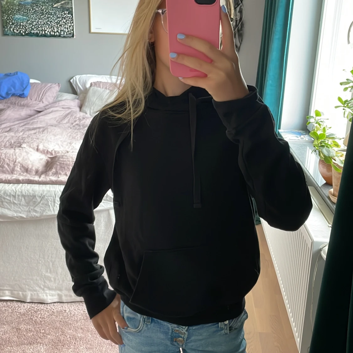 En svart hoodie med klassisk huva och snörning, samt en stor magficka framtill. Tröjan har långa ärmar med ribbade muddar och en relaxed passform. Perfekt för chill dagar eller när du vill ha en enkel och stilren look. Den är mjuk och skön. Passar mig som har xs och s i tjock tröjor.