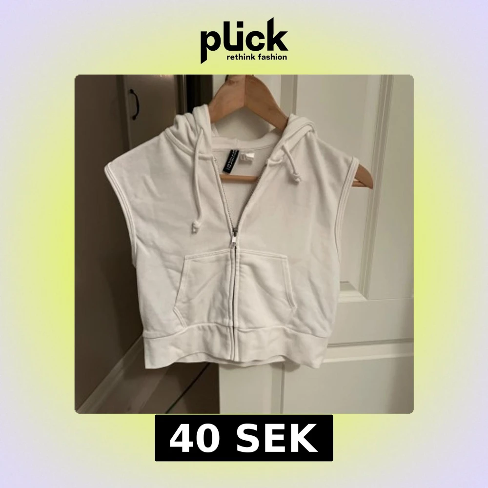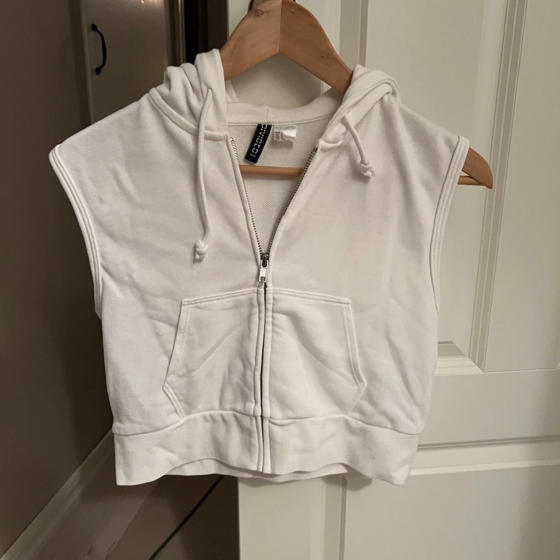 Snygg vit croppad väst från HM med dragkedja och huva. Perfekt för en avslappnad stil. Västen har en praktisk ficka framtill och är ärmlös.