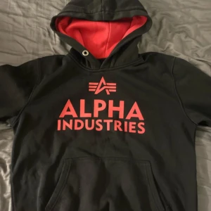 Säljer en svart hoodie från Alpha Industries med röd insida i huvan och röd logga på bröstet. Tröjan har en klassisk känguruficka och långa ärmar. Perfekt för en avslappnad stil.