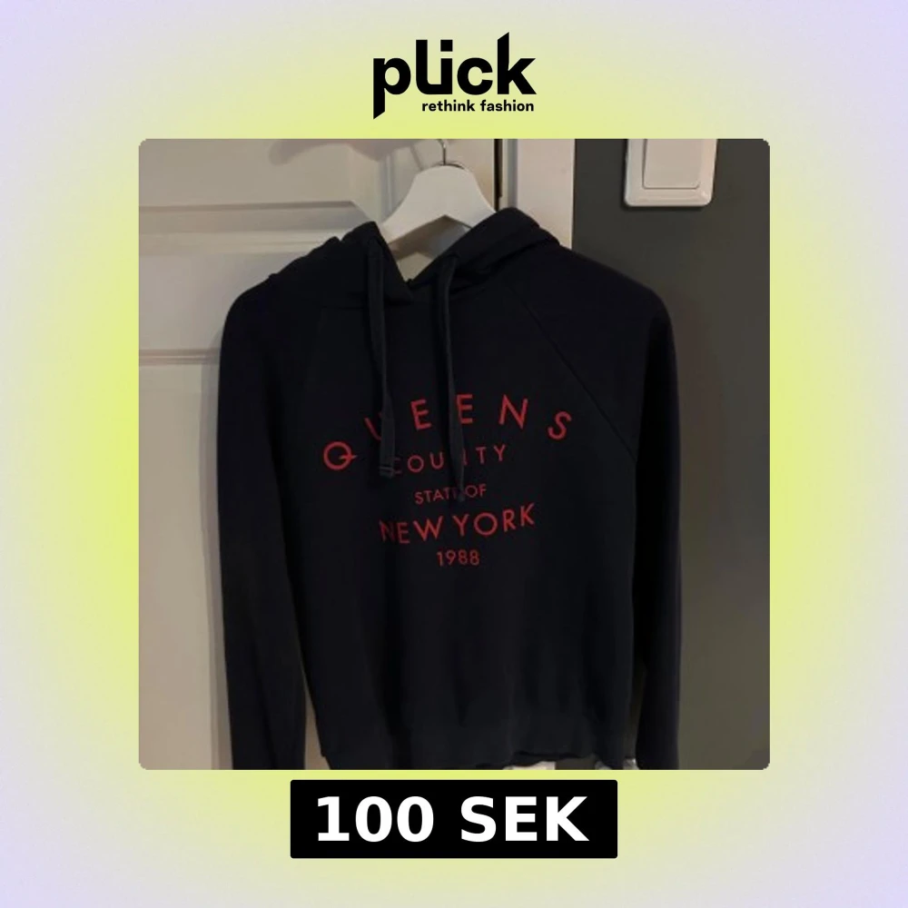 Mörkblå hoodie från Gina Tricot med röd text på bröstet där det står 'Queens County State of New York 1988'. Tröjan har huva med dragsko och långa ärmar. Perfekt för en avslappnad stil.