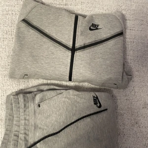 Detta är ett grått Nike tech fleece set från TJEJ avdelningen. Detta betyder att zip hoodien är kortare och samma med byxorna. Zip hoodien är mer använd, den är lite sliten vid handlederna men byxorna är helt i skick. Köpt från JD sport för 2300kr.