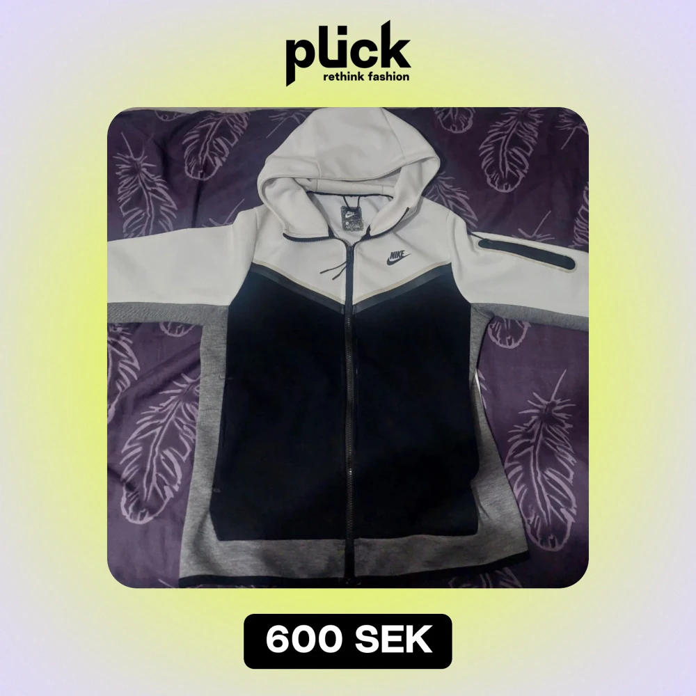 Nike tech - Säljer en stilren vit hoodie från Nike med dragkedja och huva. Jackan har svarta detaljer och en liten Nike-logga på bröstet. Perfekt för en avslappnad look.