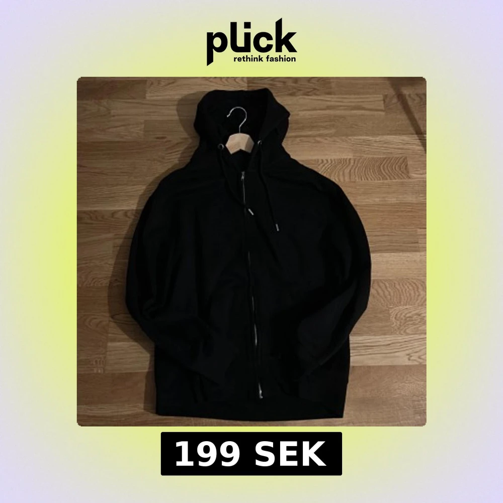 Svart hoodie från Pull&Bear i storlek M. Tröjan har huva med snörning, hel dragkedja framtill och ribbade muddar vid ärmslut och nederkant. Perfekt för chill dagar och enkel att matcha med jeans eller joggers.