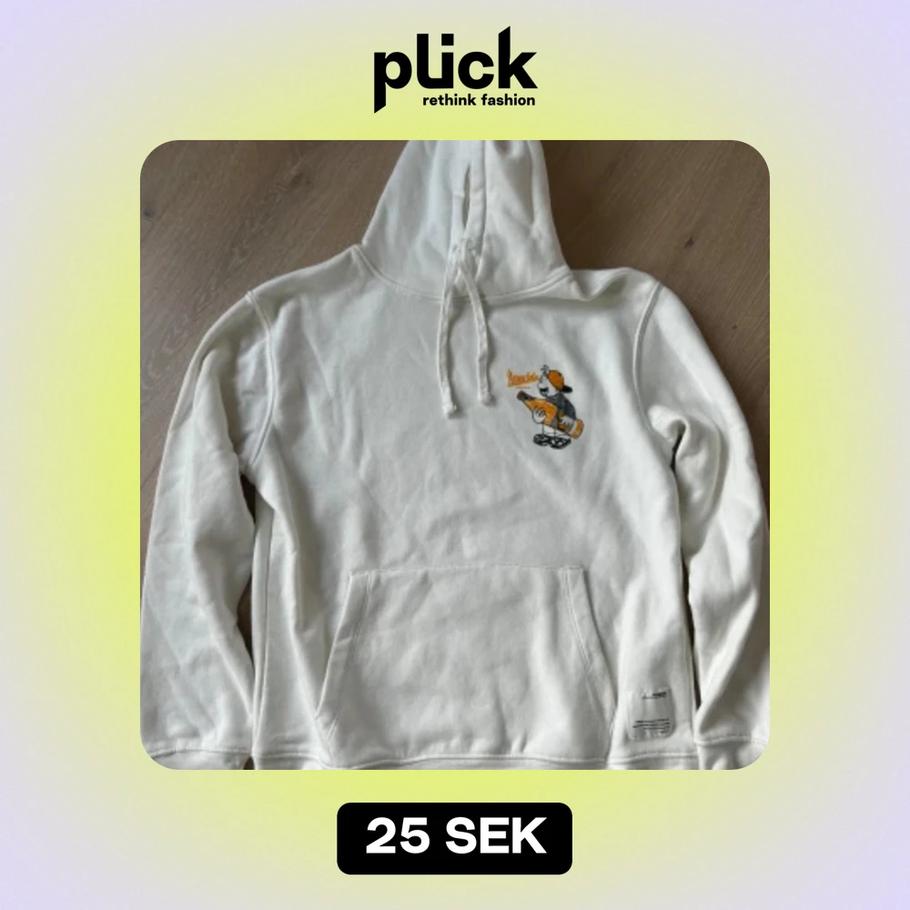 Antingen gillar man den eller inte! Vit hoodie med orange tryck. Aldrig använd. Storlek XS.