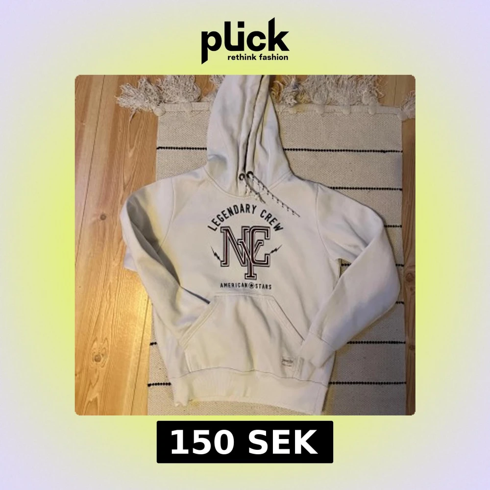 Vit hoodie från American Stars med tryck 'Legendary Crew' och stora bokstäver NC framtill. Tröjan har huva med snörning och en stor magficka. Perfekt för dig som gillar sportig och avslappnad stil.