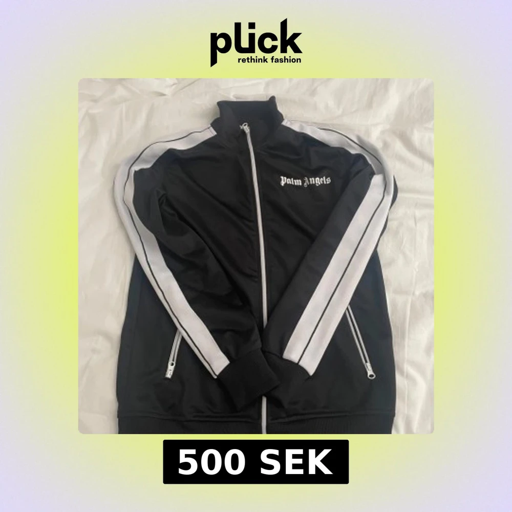 Säljer en svart track jacket från Palm Angels med vita ränder längs ärmarna och dragkedja framtill. Jackan har hög krage, ribbade muddar och två fickor med dragkedja. Klassisk logga på bröstet. Storlek XS men passar som S/M, priset kan diskuteras