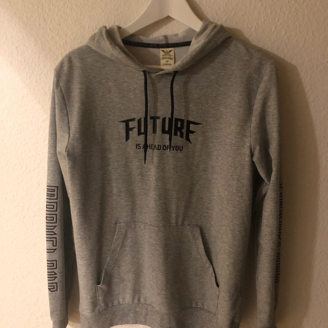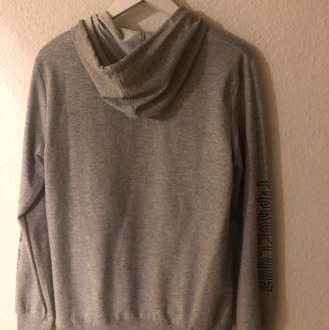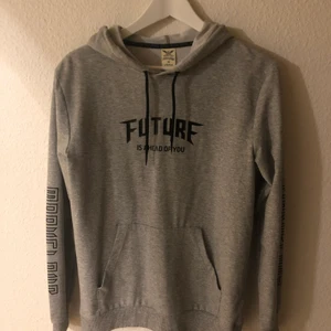 Grå hoodie med tryck. Storlek M. Aldrig använd. Köparen står för frakt.