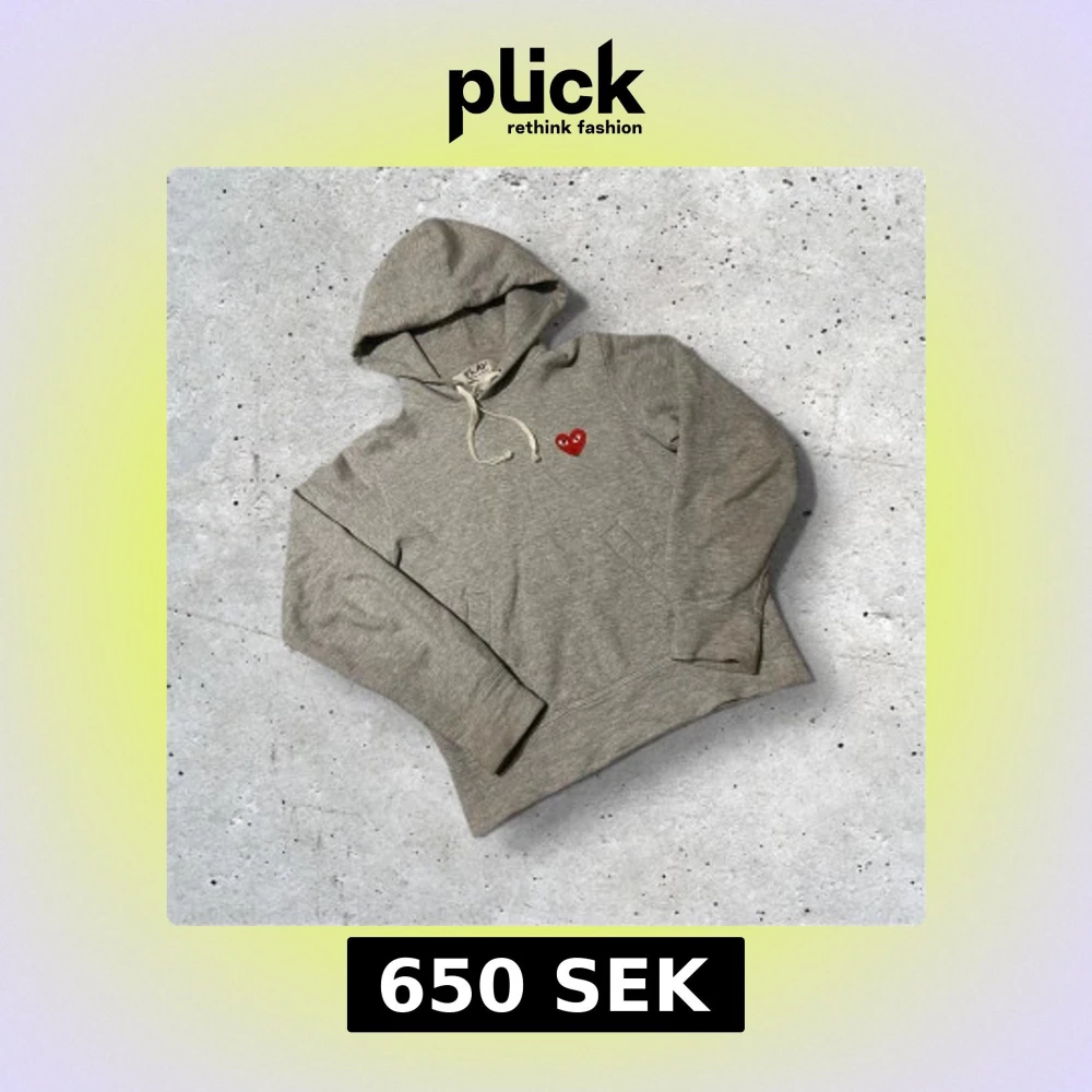 Snygg grå hoodie från Comme des Garçons Play med klassiskt rött hjärta med ögon broderat på bröstet. Mjuk bomullsmix, dragsko i huvan och känguruficka framtill. Perfekt för en chill och stilren look.