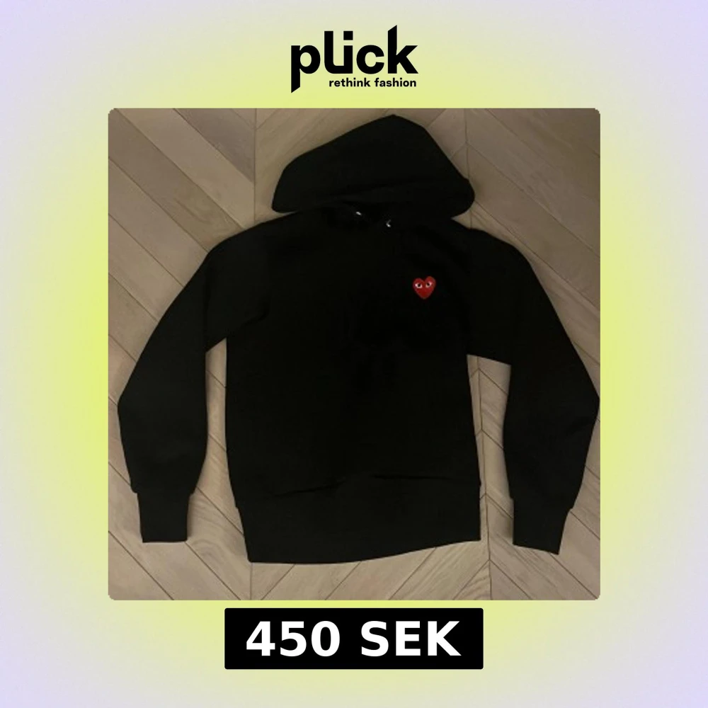 Svart hoodie från Comme des Garçons Play med klassisk huva och snörning. På bröstet sitter det ikoniska röda hjärtat med ögon. Passar folk som är runt 165 cm, både män och kvinnor. Är storlek M men är väldigt liten.