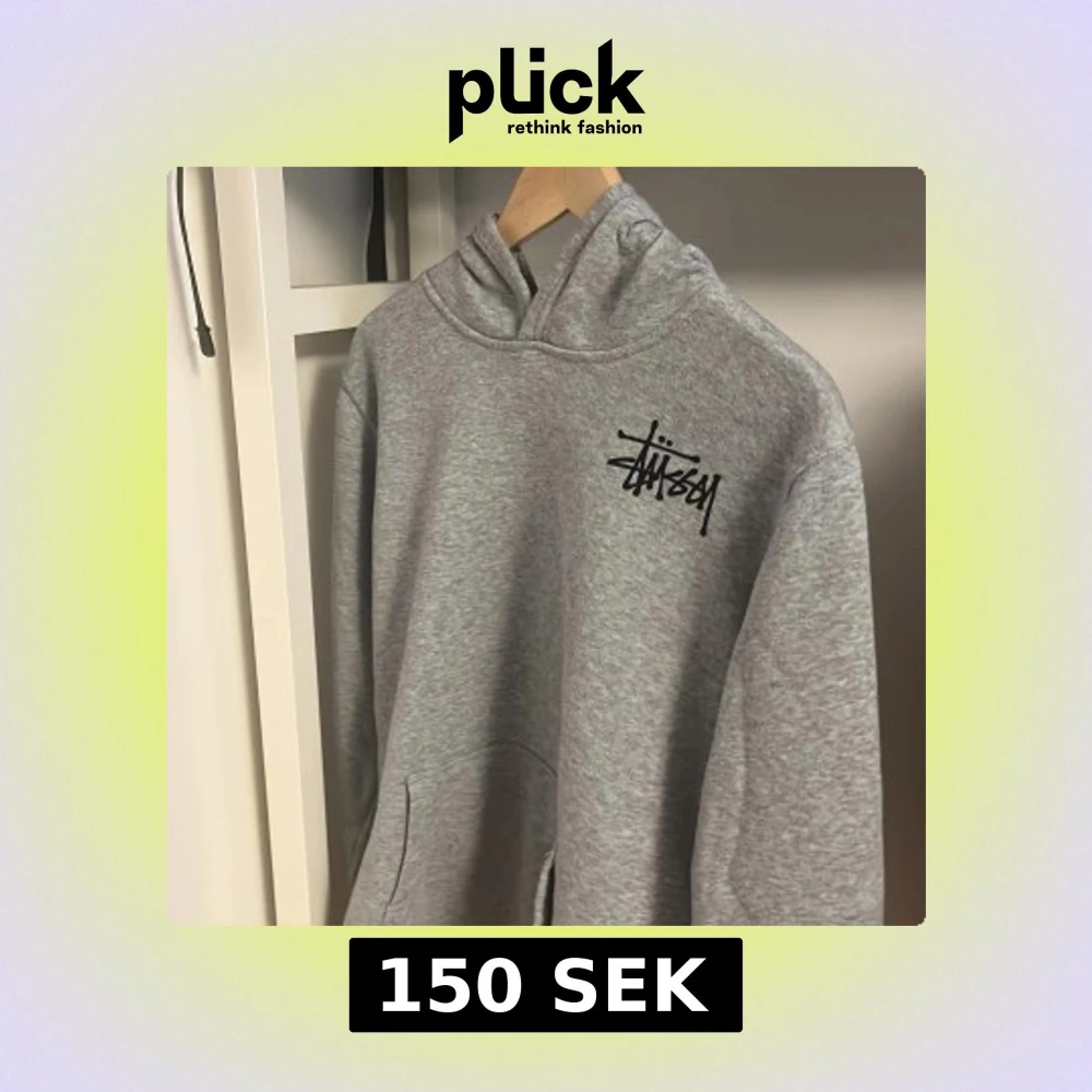 Säljer en grå hoodie från Stüssy med svart logga tryckt på både bröstet och ryggen. Köpt på plick för 200kr. Storleken står XS men den passar mer som en S/M. Fint skick och skön överlag.