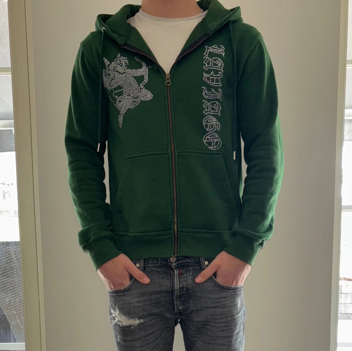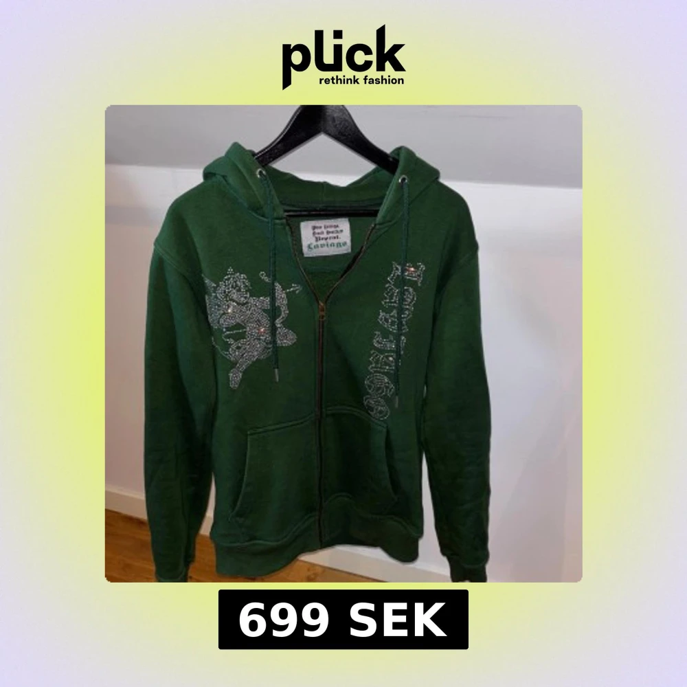 Hej, säljer en Rhinestone hoodie i en riktigt snygg mörk grön färg perfekt för sommaren! Skick 10/10 | Nypris 800 kr | Strlk M | Har du fler funderingar är de bara att höra av dig! Modellen är 180 cm och väger 70 kg.